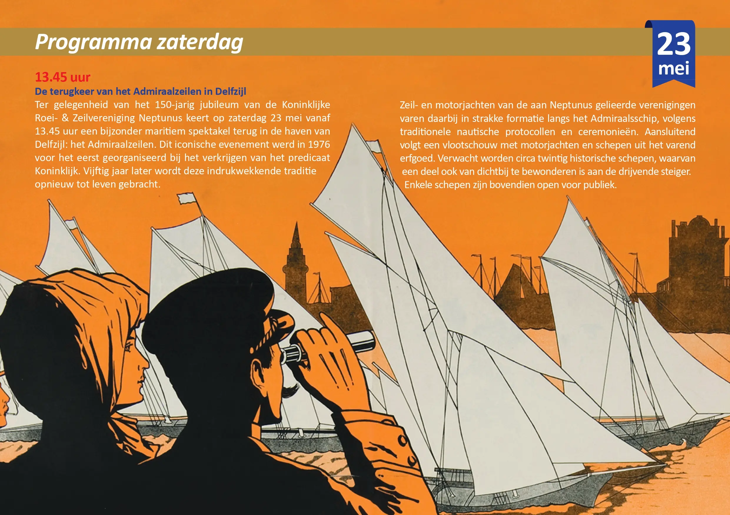 Een jubileumjaar met een saluut naar het verleden en een impuls naar de toekomst In 1976 zijn we koninklijk geworden. De Pinksterfeesten werden toen opgeluisterd door het zogenaamde Admiraalzeilen. De schepen varen langs het Admiraalschip om de admiraal van de vloot te groeten. Dit gaan we op zaterdag herhalen in de haven van Delfzijl.